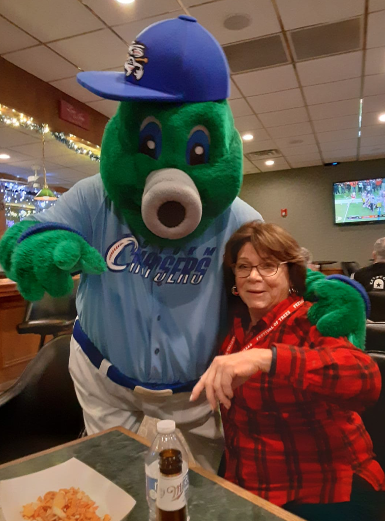 Stormy from the Omaha Storm Chasers taking pictures at the Feztival of Trees with guests.