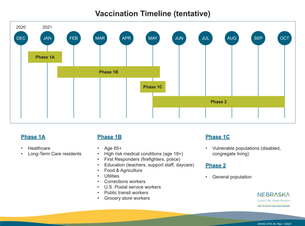 As vaccines are being distributed across the country, Nebraska is vaccinating its citizens in phases. The state is currently in Phase 1-B , which includes essential workers and people over the age of 65.