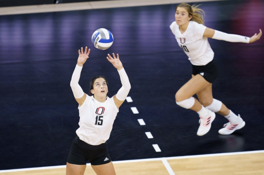 Summit League setter of the Year, Sami Clarkson, and setting Conference Player of the Year, Sadie Limback for the kill. Baxter Arena, 2021