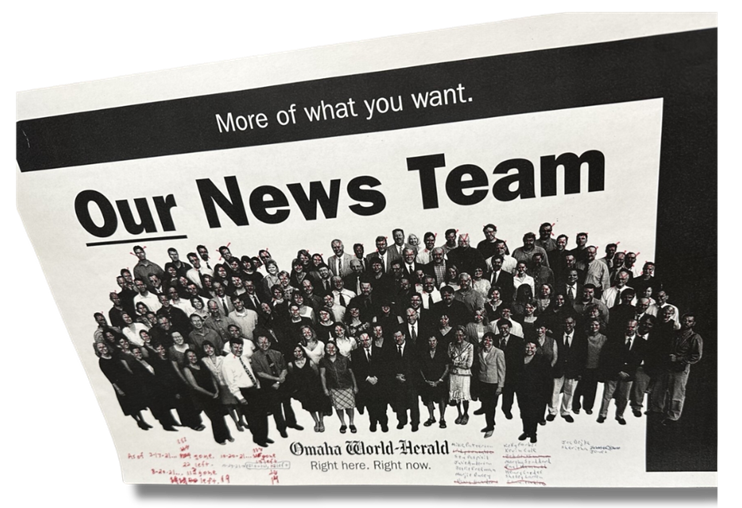 A photo of The Omaha World Herald staff showing those who have left or have been laid off. (Photo/Daytin Inserra-Cunningham)
