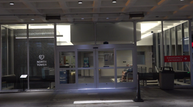 Two patients sit in a waiting room at the North Tower entrance of Methodist Hospital in Omaha, NE.