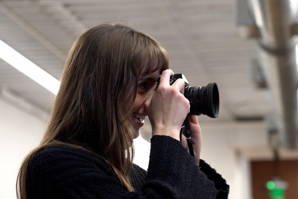 Workshop attendee Leah Hile uses a vintage 35 mm film camera to take portraits at The Union for Contemporary Art on Feb. 6, 2025. Andrew Smith/The Omaha News