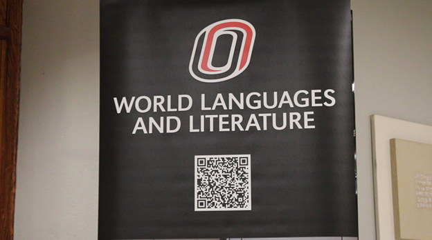 (The University of Nebraska Omaha sign for the Department of World Languages and Literature. (Photo by Jade Thornton, 2025)