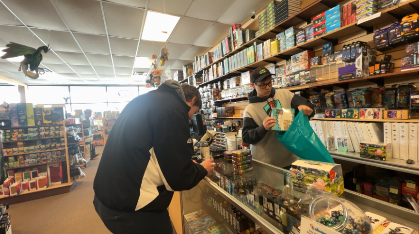 A customer makes a purchase at The Game Shoppe in Omaha as Nebraska’s