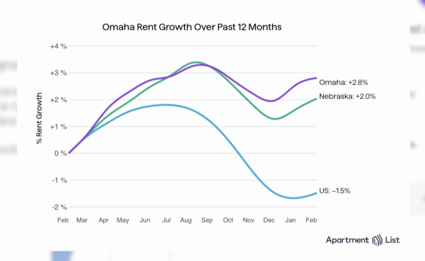 A chart from Apartment List shows rent prices in Omaha increasing by about 2.8% over the past year, outpacing both the Nebraska statewide increase and the national trend.