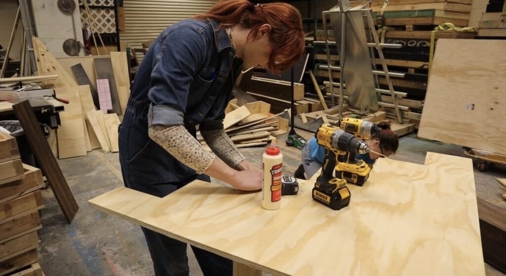 Stage Carpenter Barb Spicka uses a power drill and wood glue to assemble a custom scenic piece in the UNO theatre shop. Spicka is part of the technical team building a durable, audience-ready set for the upcoming immersive production of Romeo and Juliet.